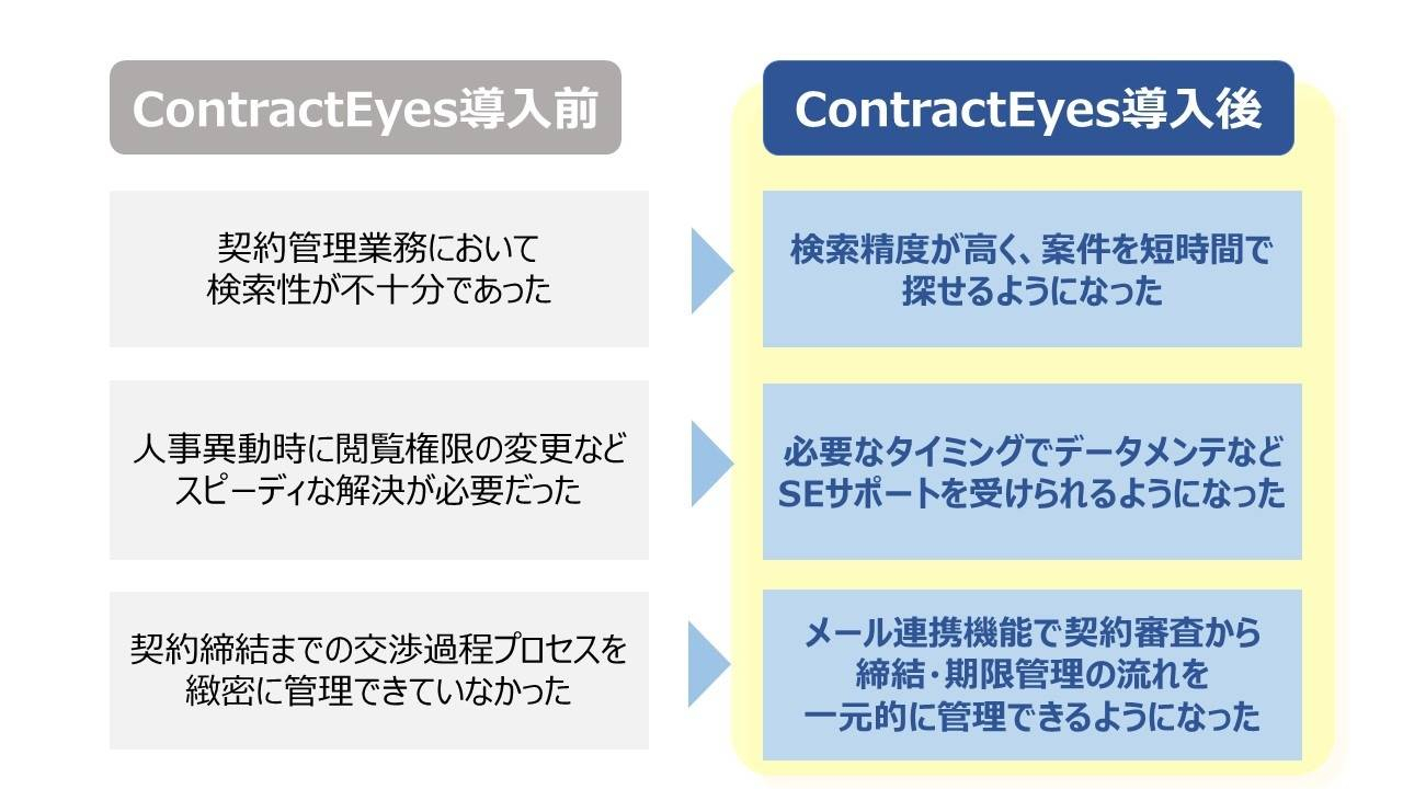 契約管理システム「ContractEyes(コントラクトアイズ)」を用いることで、契約審査・管理の効率化を実現し、法務担当者の負荷を大幅に軽減しました。